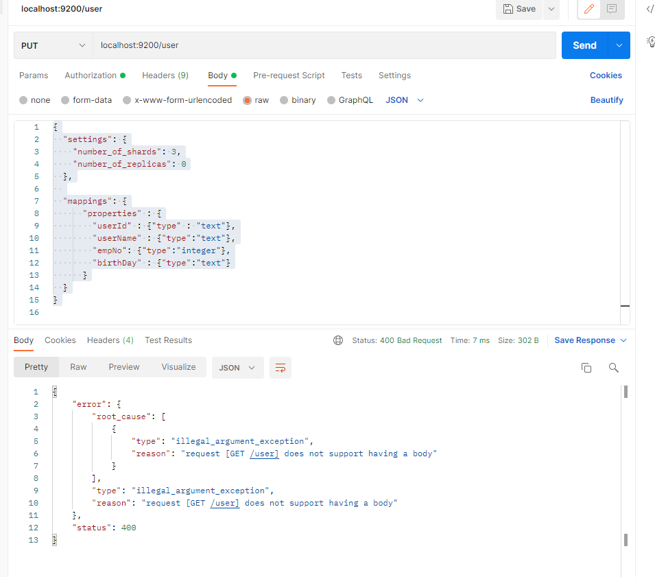 POSTMAN 을 이용하여 test 하였으며, Index 를 생성하는 요청을 보내보자.