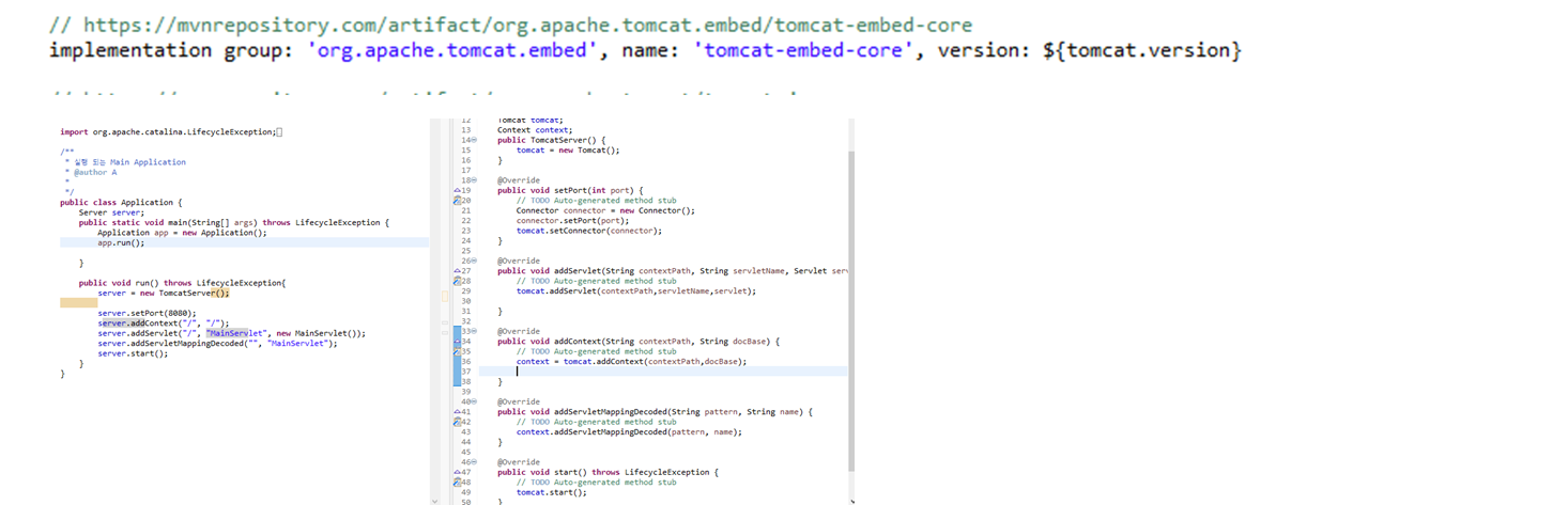 이미 Tomcat 등 Web Container 에서는 임베디드가 가능하도록 Container 자체의 core 모듈을 실행할 수 있도록 배포한다.